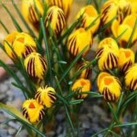 Оригинальный ботанический крокус Гипси Герл является, пожалуй, одним из самых необычных первоцветов. Сквозь еще не полностью сошедший с земли снег с приходом марта начинают пробиваться тоненькие листочки, на фоне которых чуть позже появляются шикарные бокалы-биколоры. Лепестки цветков, окрашенные в солнечно-желтый цвет, с внешней стороны украшены темно-фиолетовыми полосами. А в самом центре Гипси Герл расположились изящные тычинки сочно-оранжевого окраса.