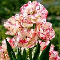 Тюльпан Белиция, относящийся к группе многоцветковых, порадует садоводов своим цветением в середине мая. Его огромные бутоны, в обхвате достигающие около 12 см, состоят из множества нежно-кремовых лепестков, обрамленных тонким кантом розового цвета. По каждому соцветию растения хаотично разбросаны легкие штрихи и изящные мазки розового оттенка. Лепестков у тюльпана этого сорта так много, что они расходятся в стороны, придавая цветам сходство с пушистыми снежками.