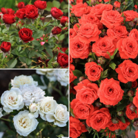 В состав комплекта входят: Роза Скарлет Хит, Роза Уайт Кавер и Роза Оранж Мини.